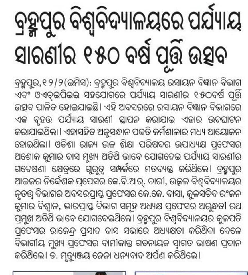 The United Nations has designated 2019 as the International Year of the Periodic Table to celebrate "one of the most significant achievements in science". In March, it will be 150 years since the Russian scientist, Dmitri Mendeleev, took all of the known elements and arranged them into a table. On this behalf, Department of chemistry Berhampur University has established a biggest Periodic table in the country India by 12th February 2019. The periodic table was unveiled by Prof. K V R Chary , Director, IISER Berhampur.
