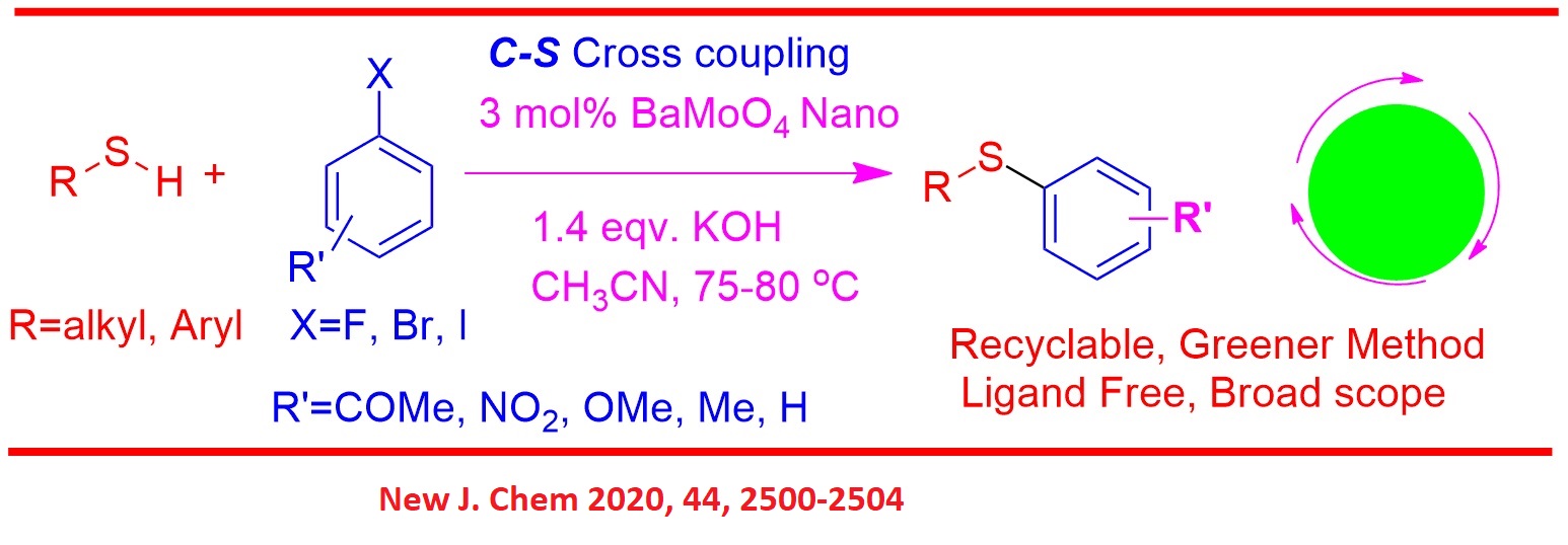 25. Bimetallic BaMoO4 Nanoparticle for C-S Cross-Coupling of Thiols with Haloarene. Subhalaxmi Panda, Pradyota Kumar Behera, Santosh Kumar Sahu, Reba Panigrahi, Bamakanta Garnaik and Laxmidhar Rout, New J. Chem 2020, 44, 2500-2504; https://doi.org/10.1039/C9NJ05581A (IF 3.6) |