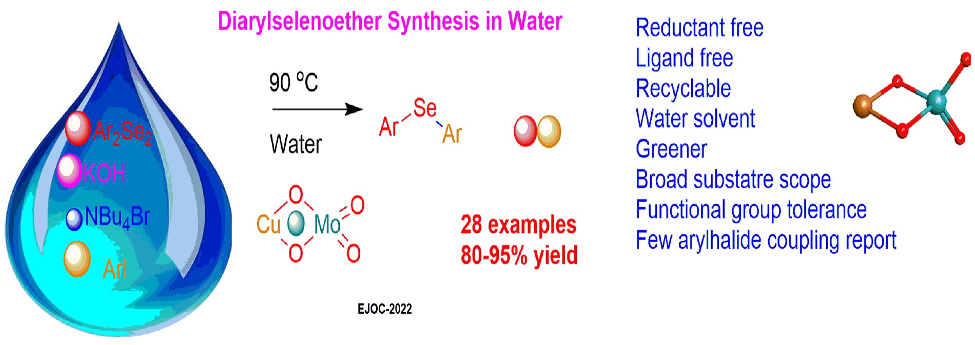 37. CuMoO4 Catalyzed Csp 2-Se Cross-Coupling of Aryl Bromide and Iodide with Diaryldiselenides in Water; P Choudhury, A. K. Pradhan, S. Jena, B. K. Sahoo, S. K. Sahu, P. K. Behera, P. Behera, A. Swain,and Dr. Laxmidhar Rout , 2022, https://chemistry-europe. |